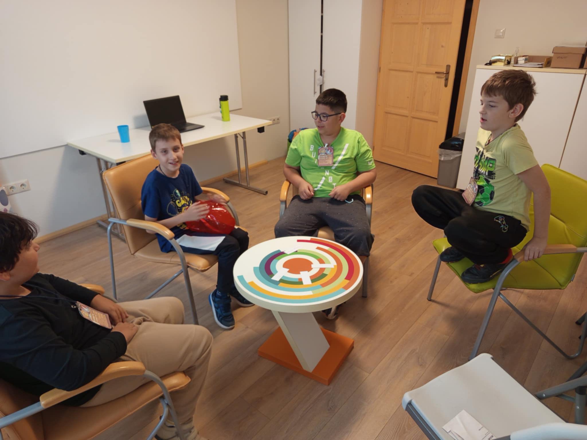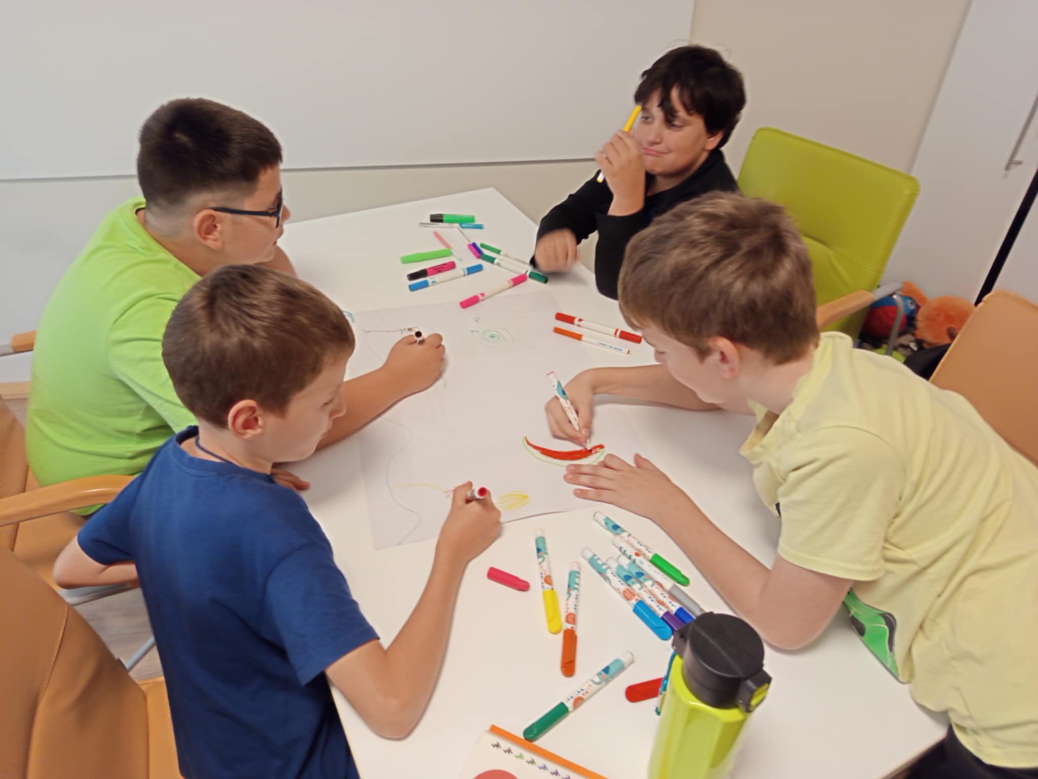 “2025. szeptember 18-án, csütörtökön találkozott a vakáció után először, kis csapatunk. Nagyon örült egymásnak a négy jó barát, többen kifejezték azt is, hogy örömmel jöttek újra a klubba. Természetesen ez az alkalom a nyári szünidő élményeinek jegyében zajlott. A beszélgetéshez körbe ültünk és akinél volt a strandlabda, az húzhatott egy kérdés kártyát, amit felolvasva annak tett fel, akinek a labdát dobta. Az illető válaszolt a kérdésre, majd ő is továbbította a labdát, mindaddig, míg mindenki mesélt magáról az adott témában. Megtudtuk, hogy mindannyian voltak valamilyen vízparti helyen, mindenki járt a nyáron moziban és a legtöbben voltak valamilyen táborban is. A beszélgetés után készítettünk egy közös rajzot, melyen a nyári élményeink egy-egy részletét jelenítettük meg. Elég modern kép lett! A rajzolást követő kupaktanács során megszavaztuk, hogy űrutazásunk folytatódjon és egy különös, régi térkép segítségével ezúttal az egészség galaxisba utazzunk el. A jó hangulatú alkalom ezúttal is nasizással zárult (a jövőbeni úticélunk miatt, lehet, hogy ezen a szokásunkon változtunk kell majd J).”